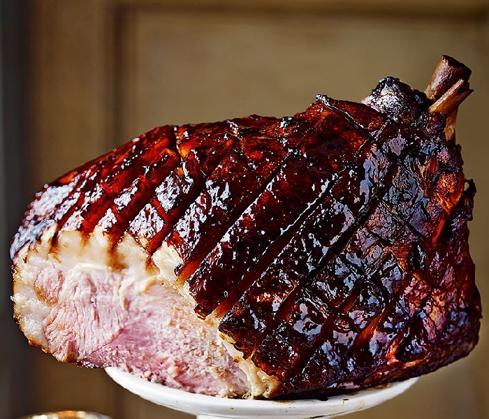 - In a small saucepan add the honey and Demerara sugar and warm through, pour all over the ham and bake for 25 minutes basting the juices a few times as it cooks.